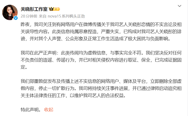 1月3日早晨,关晓彤工作室发布消息,我司关注到有网络用户在微博传播关于我司艺人关晓彤恋情的不实言论及相关误导性内容。此类信息纯属恶意捏造,严重失实,已构成对我司艺人关晓彤的诽谤,并对其个人声誉、公众形象及正常工作生活造成了极大困扰与负面影响。